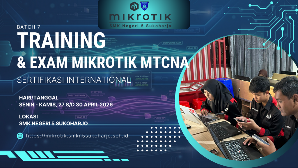 SMK Negeri 5 Sukoharjo kembali menghadirkan kesempatan emas bagi seluruh siswa untuk meningkatkan kompetensi di bidang jaringan komputer melalui kegiatan Training & Exam MTCNA (MikroTik Certified Network Associate) bekerja sama dengan MikroTik.